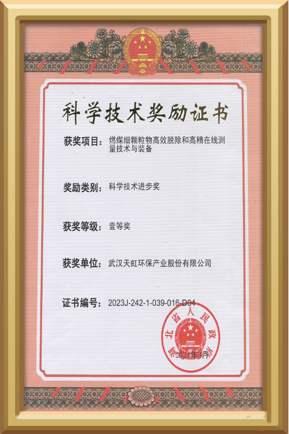 武漢天虹環(huán)保產(chǎn)業(yè)股份有限公司燃煤細(xì)顆粒物高效脫除和高精在線測量技術(shù)與裝備項(xiàng)目榮獲湖北省科學(xué)技術(shù)進(jìn)步獎一等獎;