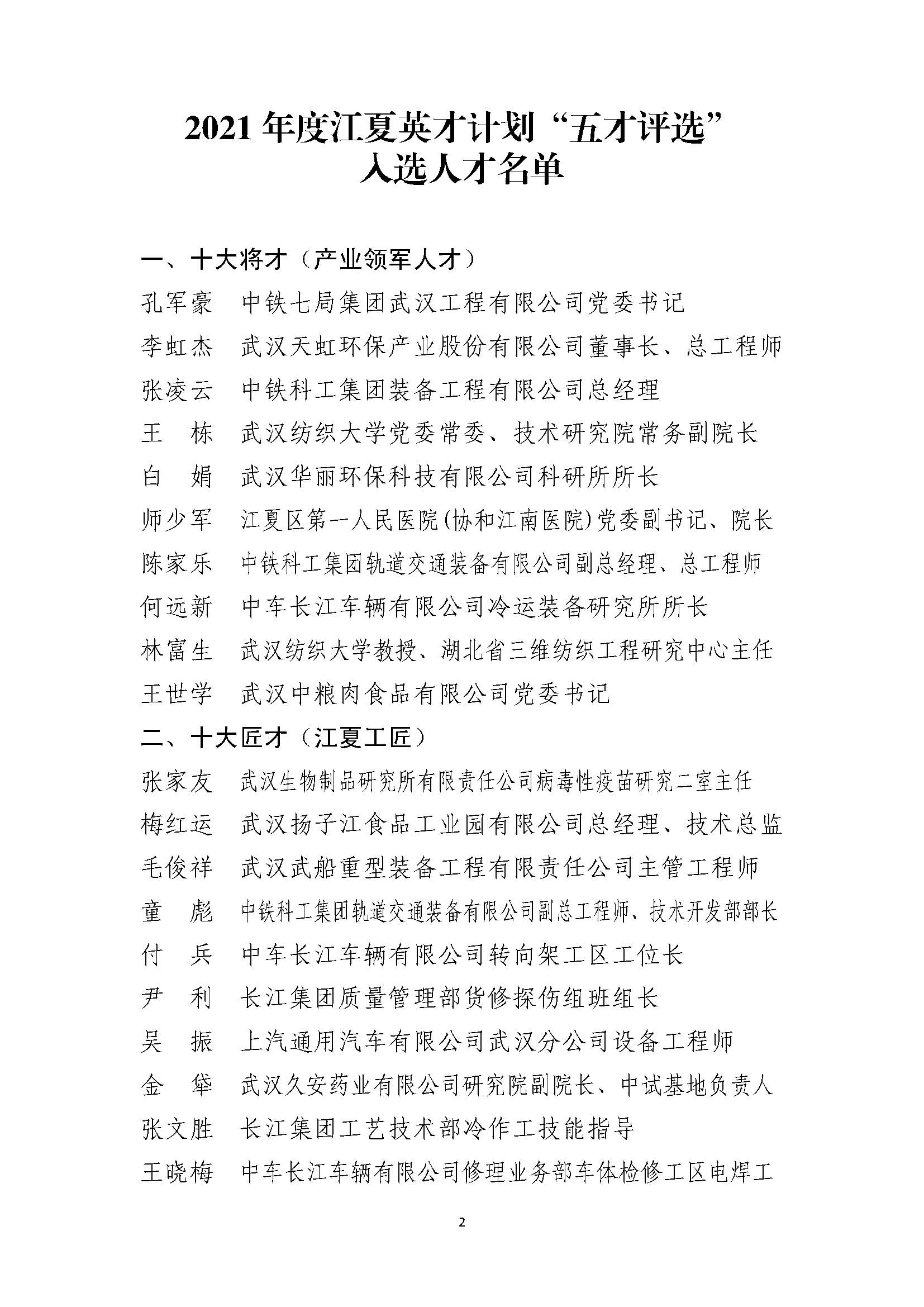 2021年12月7日,中共江夏區(qū)委人才工作領(lǐng)導(dǎo)小組辦公室正式對外發(fā)布了《關(guān)于印發(fā)2021年度江夏英才計劃“五才評選”入選人才名單的通知》,公司李虹杰董事長榮膺“十大將才(產(chǎn)業(yè)領(lǐng)軍人才)”稱號。
